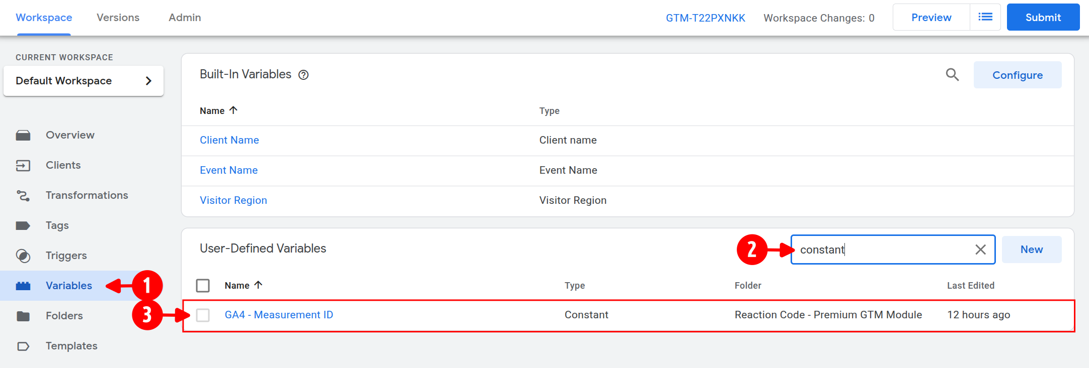 - In your GTM server-side workspace, click on Variables.
